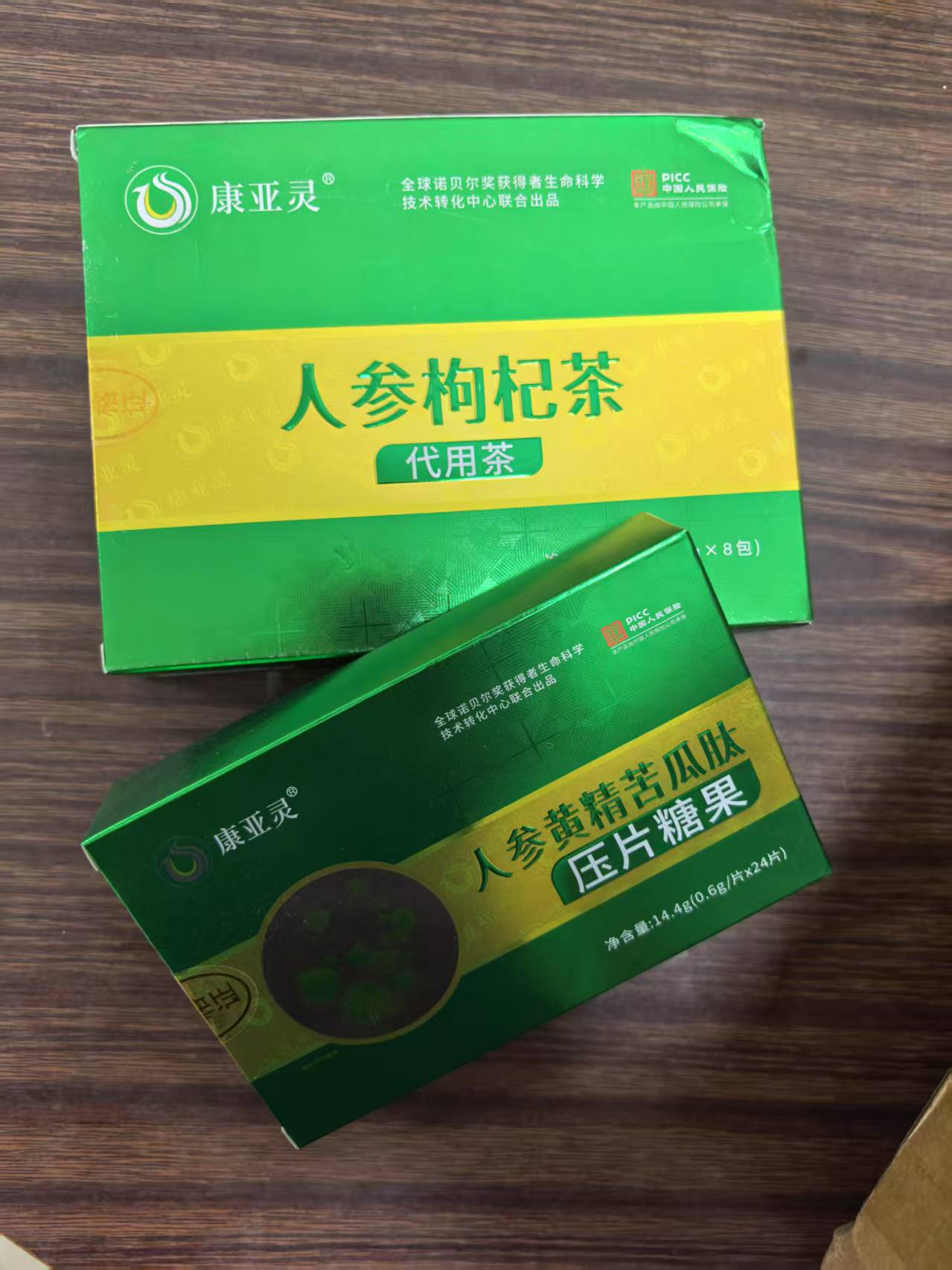 人参黄精苦瓜肽 净含量;14.4g(0.6g/片×24片/盒) 人参枸杞茶 净含量:80g(10g×8包/盒)